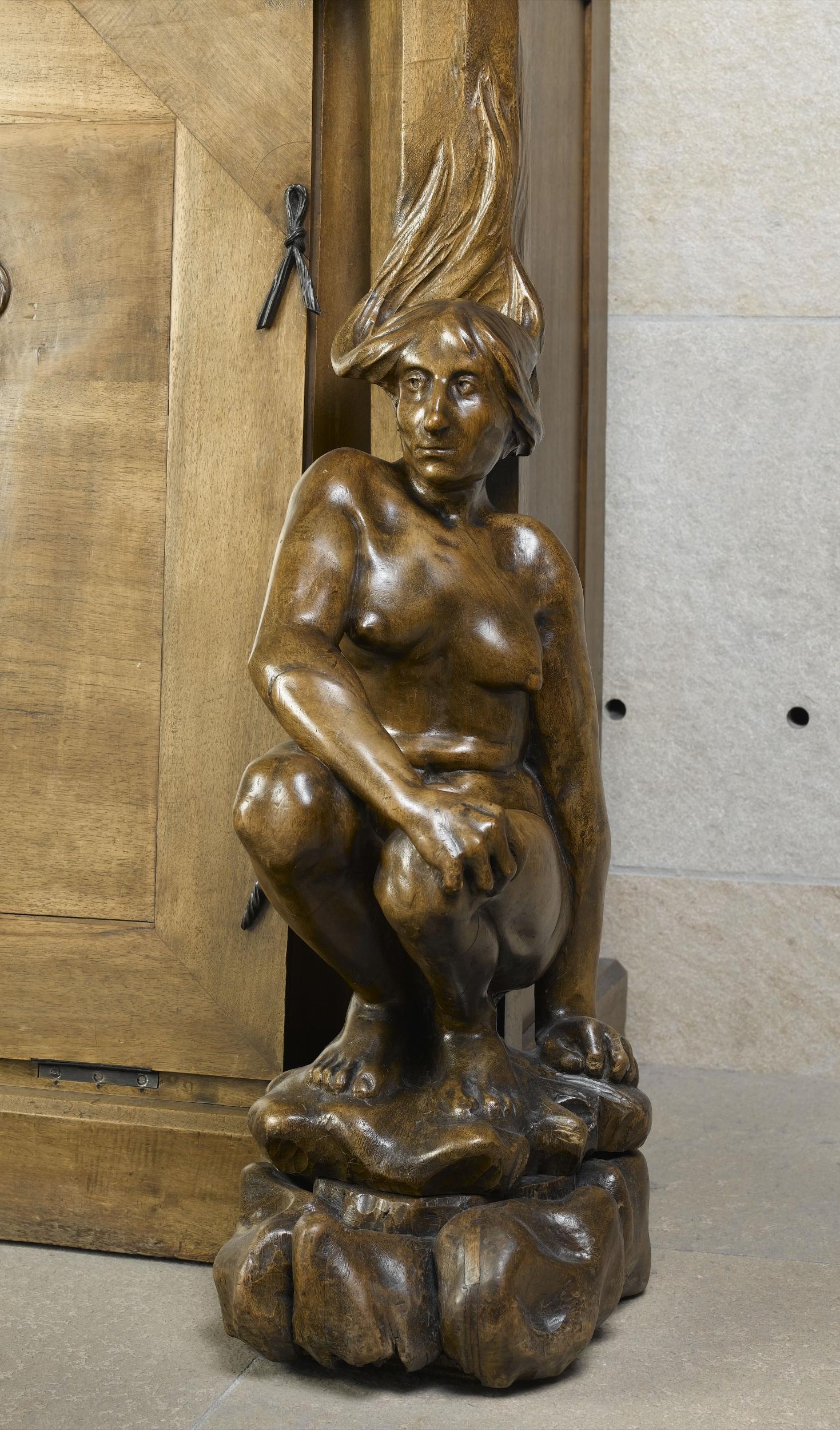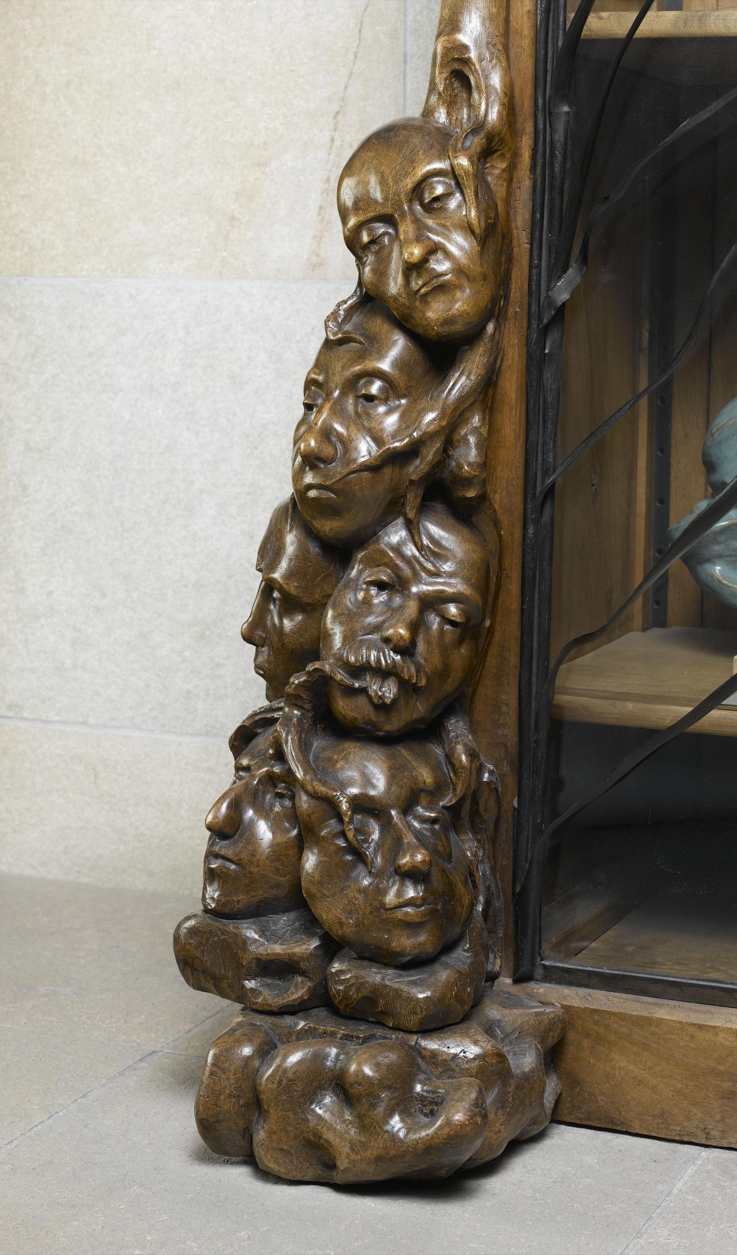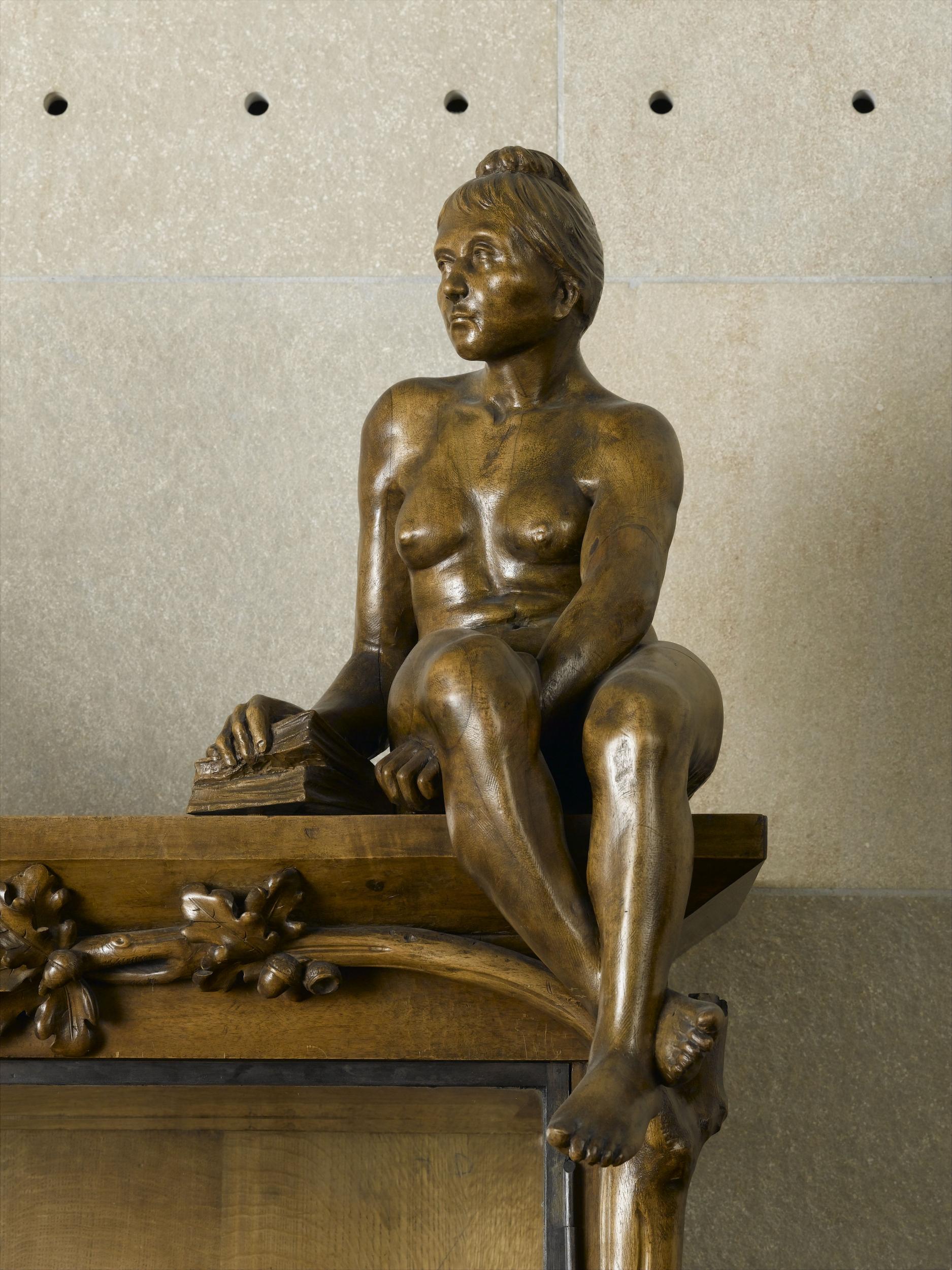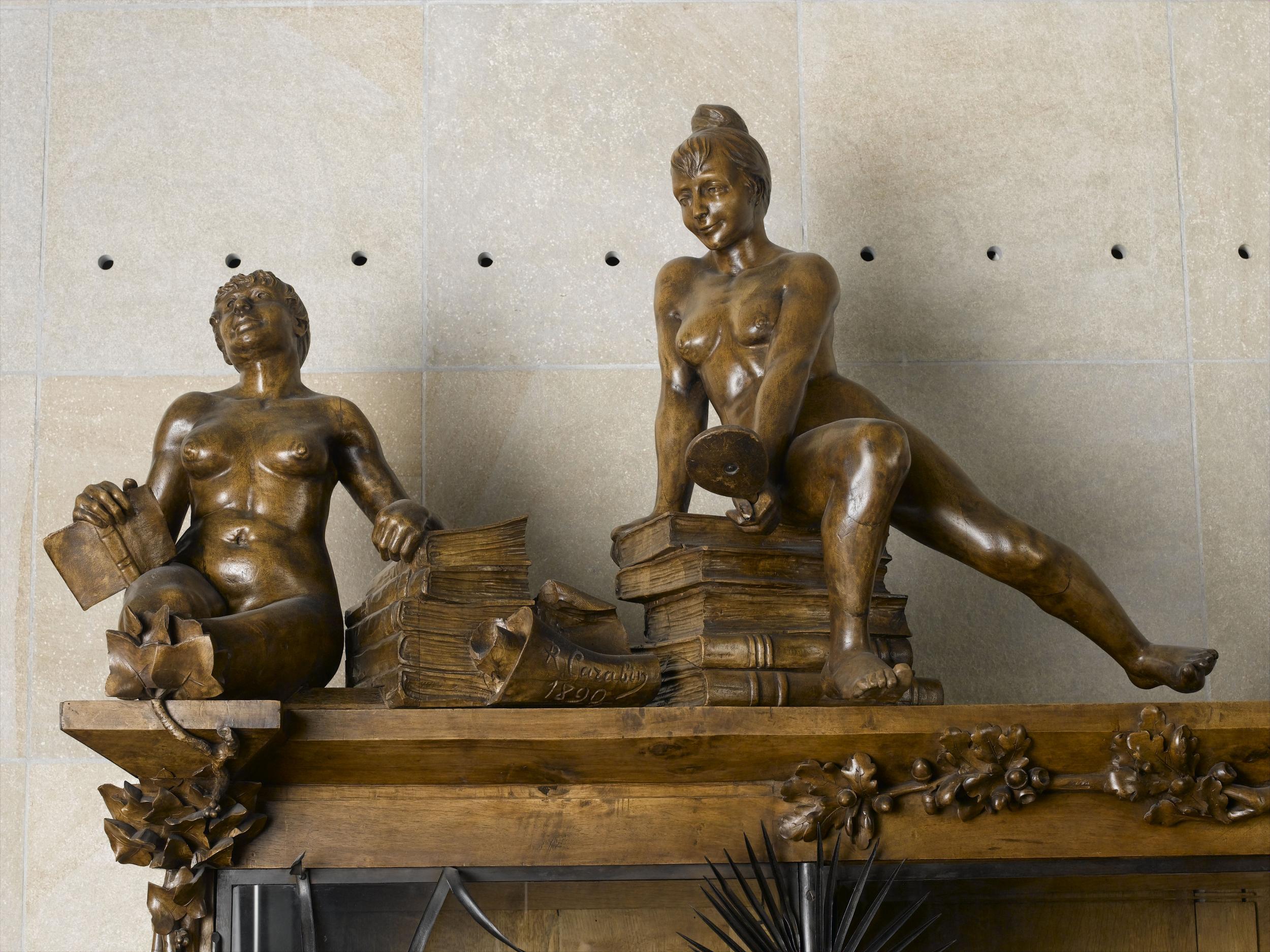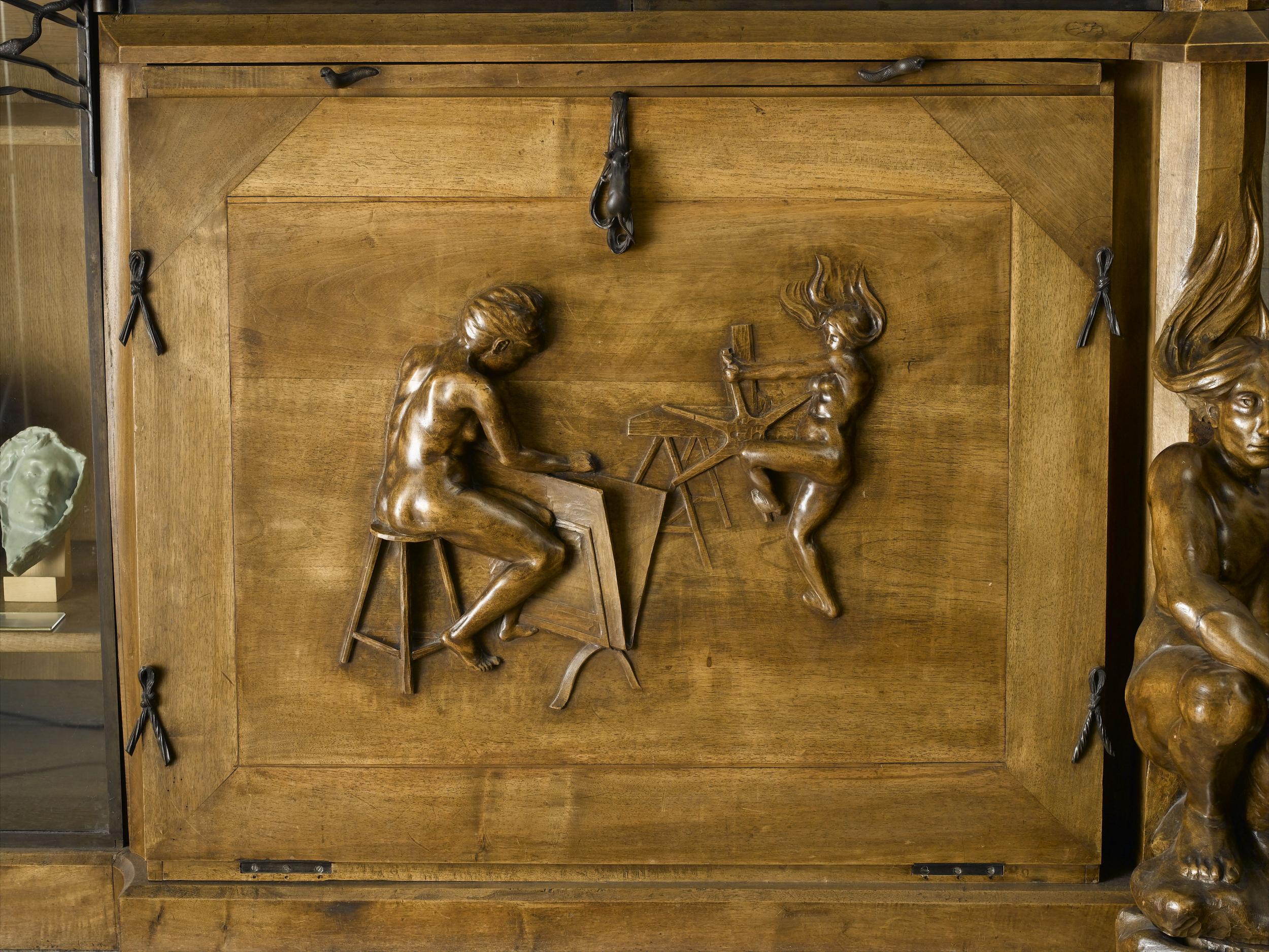Au 19ème siècle, le goût pour la science touche tous les arts, y compris les arts décoratifs ! Cette bibliothèque réalisée par François-Rupert Carabin en est un bon exemple. Il s’agit du premier meuble que réalise cet artiste, sculpteur de formation. Et d’ailleurs, cela se voit un peu, puisqu’on retrouve à différents endroits de la bibliothèque de petites sculptures. En bas du meuble, tu peux voir des visages aux traits peu flatteurs : ils représentent l’ignorance et la bêtise. Au sommet du meuble, des jeunes femmes nues aux visages souriants s’appuient sur des livres : c’est ainsi que Carabin symbolise l’intelligence et l’étude. Pour le reste du décor, l’artiste s’est inspiré de la nature. Il a ainsi caché une multitude de motifs végétaux dans son meuble, que ce soit dans le bois ou dans la ferronnerie ! Tu peux notamment reconnaître des roseaux, sur le battant de gauche, mais aussi de la vigne vierge, qui grimpe sur le côté droit du meuble.