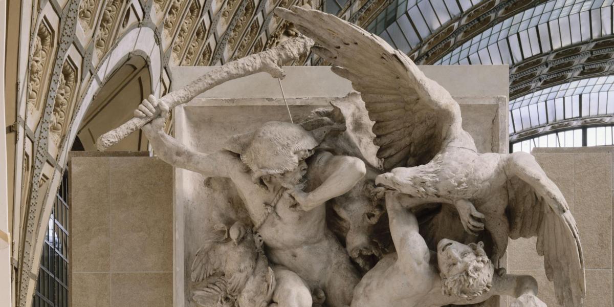 C’est à un formidable voyage dans le passé que t’invite le sculpteur Jules Coutan. L’artiste nous emmène plusieurs milliers d’années en arrière, aux temps préhistoriques…Il imagine une scène de chasse dans laquelle des hommes à peine vêtus combattent des aigles. À l’époque de Coutan, les luttes acharnées entre hommes et bêtes fascinent le public, car ces combats mettent en scène les instincts primitifs de nos ancêtres. L’un des rapaces est déjà mort, au sol, touché par une flèche de l’archer, tandis que le combat fait rage au sommet de la sculpture ; l’homme au bras tendu s’apprête à frapper le grand aigle de son gourdin. Il défend ainsi le troisième homme armé d’une pierre, qui est sur le point de perdre pied…