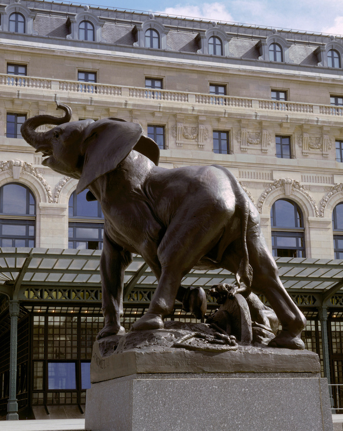 Cet éléphant en fonte, pesant près de trois tonnes, a été réalisé en 1878 par le sculpteur Emmanuel Fremiet. Il s’agit de l’une des représentations d’animaux commandées par l’Etat pour l’Exposition universelle de 1878.
