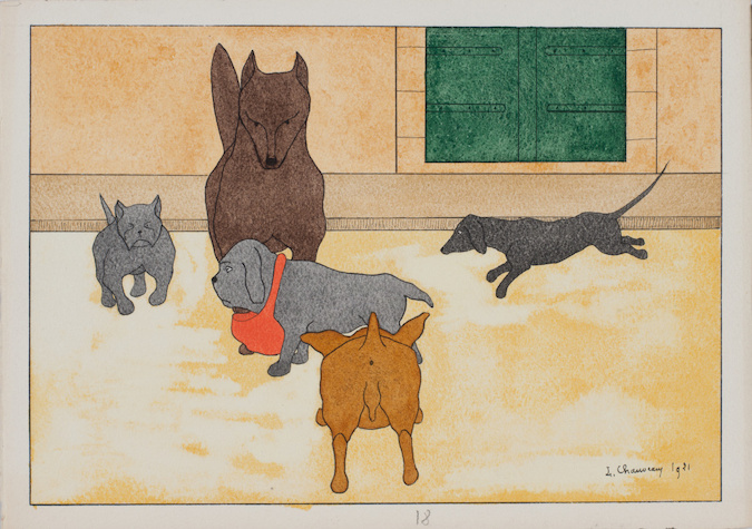Chauveau s’inspire de l’art médiéval, et tout particulièrement des vitraux et de leurs compositions épurées. Tu peux retrouver dans cette aquarelle le trait noir que l’on appelle « cerne » des objets et figures, des aplats de couleurs éclatantes, une simplification des formes et de la composition qui évoque les vitraux des églises de son enfance.