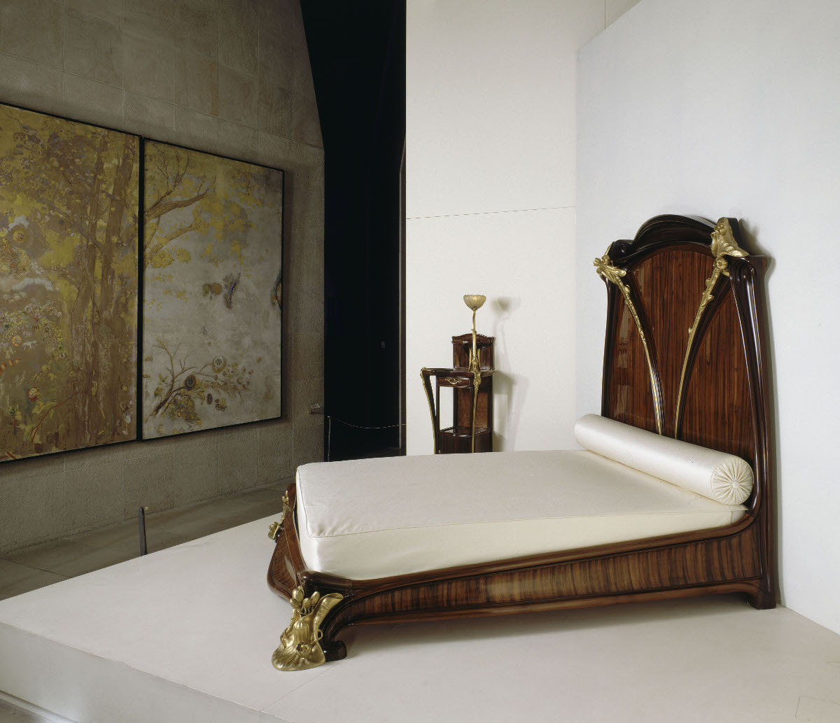 Cela ne fait aucun doute, le décorateur Louis Majorelle adore les nénuphars, ces plantes aquatiques qui poussent à la surface de l’eau ! Il en a d’ailleurs souvent intégré dans ses meubles, comme ce lit et cette table de chevet. Les pieds du lit en bronze doré représentent les fleurs en train d’éclore. La tête de lit en bois, qui cache le mur, prend quant à elle la forme de la feuille du nénuphar. Afin de décorer la chambre à coucher de manière harmonieuse, Majorelle réutilise le motif des nénuphars dans la table de chevet. Et ce n’est pas tout, il s’est également inspiré de cette plante pour réaliser des lampes !